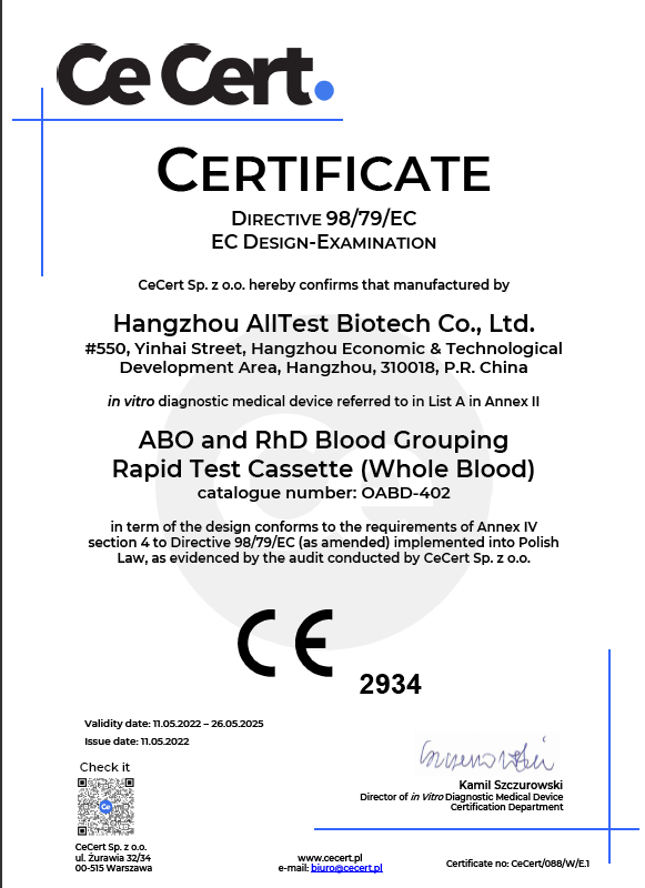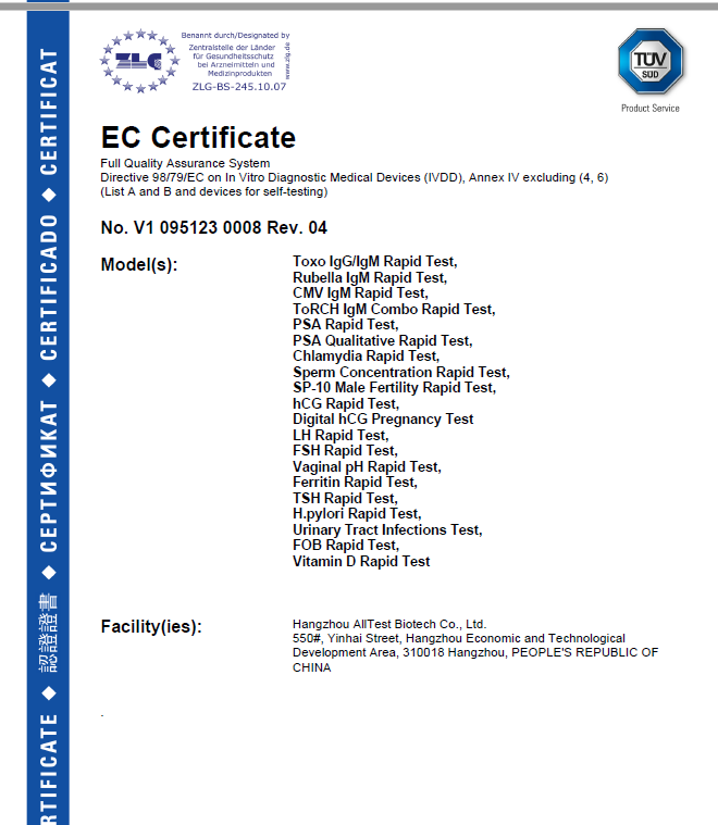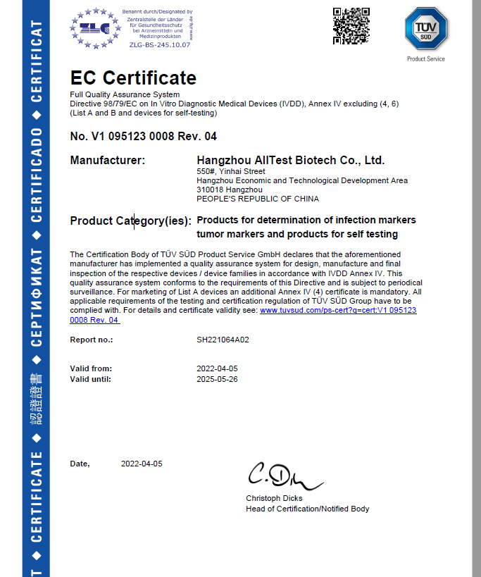 公司通過了歐洲TUV的ISO13485:2016質量管理體系認證,多項已獲歐盟CE、美國FDA、加拿大Health Canada、澳大利亞TGA、英國MHRA等多項注冊和認證。公司主要產品為快速診斷試劑,包括婦女健康檢測、傳染病檢測、毒品及藥物濫用檢測、腫瘤檢測、心臟標志物檢測等五大系列,共有 1400 多項產品暢銷全球 170 多個國家和地區。